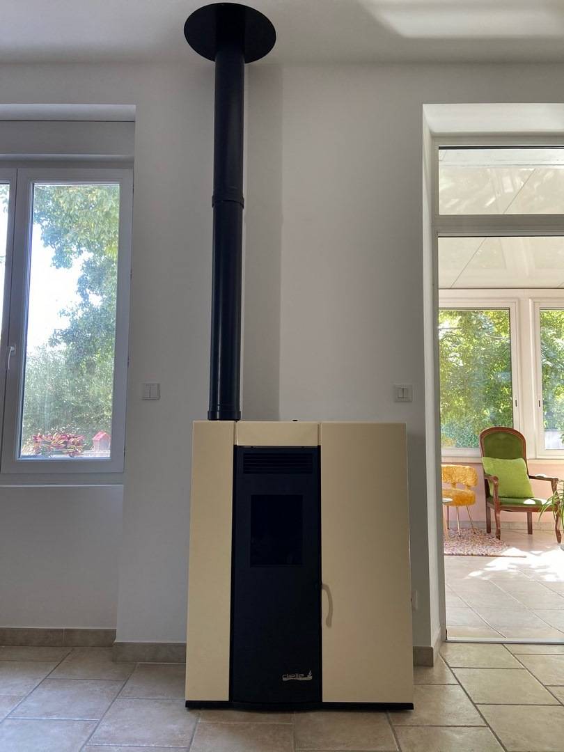 Contrairement à d'autre poêle à granulés qui sont majoritairement en sortit arrière, sachez que sur certains modèles de poêles de la marque Dielle, il est tout à fait possible de sortir le tuyau d'évacuation des fumées sur le dessus, ce qui vous fait gagner quelques centimètres derrière le poêle.