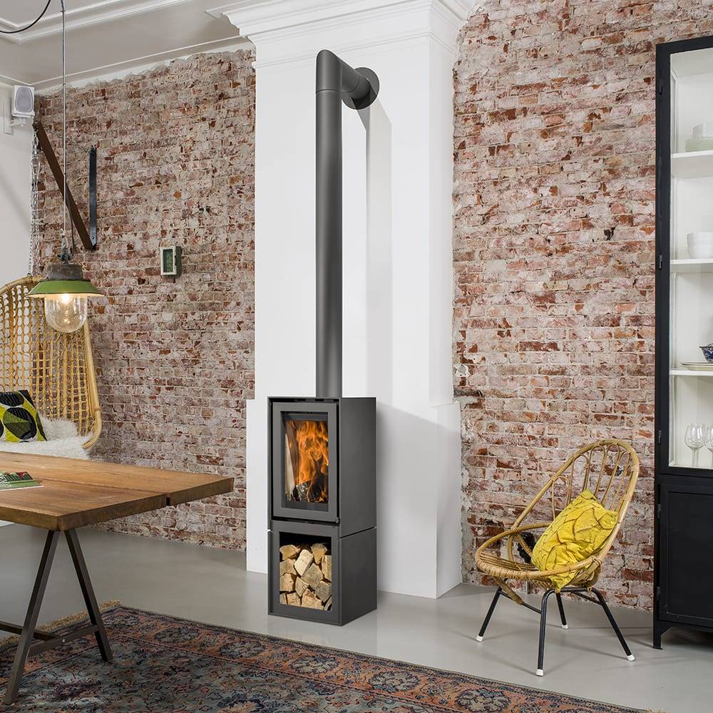 Si vous n'avez pas de cheminée, mais que le design vous correspond, alors pas de panique, le socle bûcher est justement là pour ça ! Il sera tout simplement situé sous l'appareil en suivant ces lignes très épuré.