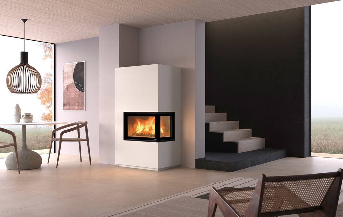 Version trois faces vitrées : pour une vision panoramique à 180° du feu.